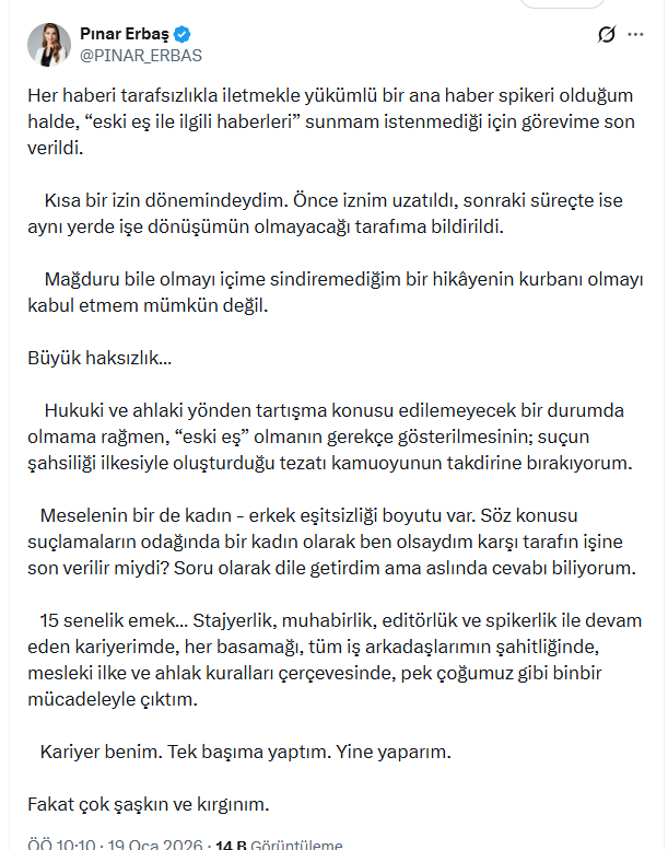 Pınar Erbaş, sosyal medya hesabından yaptığı açıklamada, görevden alınma sürecini ayrıntılarıyla anlattı. Erbaş, bir ana haber spikeri olarak her haberi tarafsızlık ilkesiyle sunduğunu vurgulayarak, şu ifadeleri kullandı: