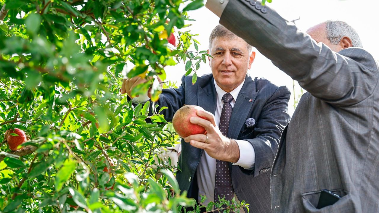 İzmir Büyükşehir Belediye Başkanı Dr. Cemil Tugay, Selçuk’un Zeytinköy Mahallesi’nde düzenlenen nar hasadına katılarak çiftçilerin bereketine ortak oldu. Hasat öncesi köy kahvesinde üreticilerle bir araya gelen Tugay, nar, ayva ve mandalina üreticilerinden bu yılın rekolte ve üretim koşulları hakkında bilgi aldı. Türkiye’nin zorlu ekonomik koşullarında üretim mücadelesi veren çiftçilerin taleplerini dinleyen Tugay, hem üretim koşullarının hem de köyün eksiklerinin giderilmesi için notlar aldı, ilgili birimlere yerinde talimatlar verdi.