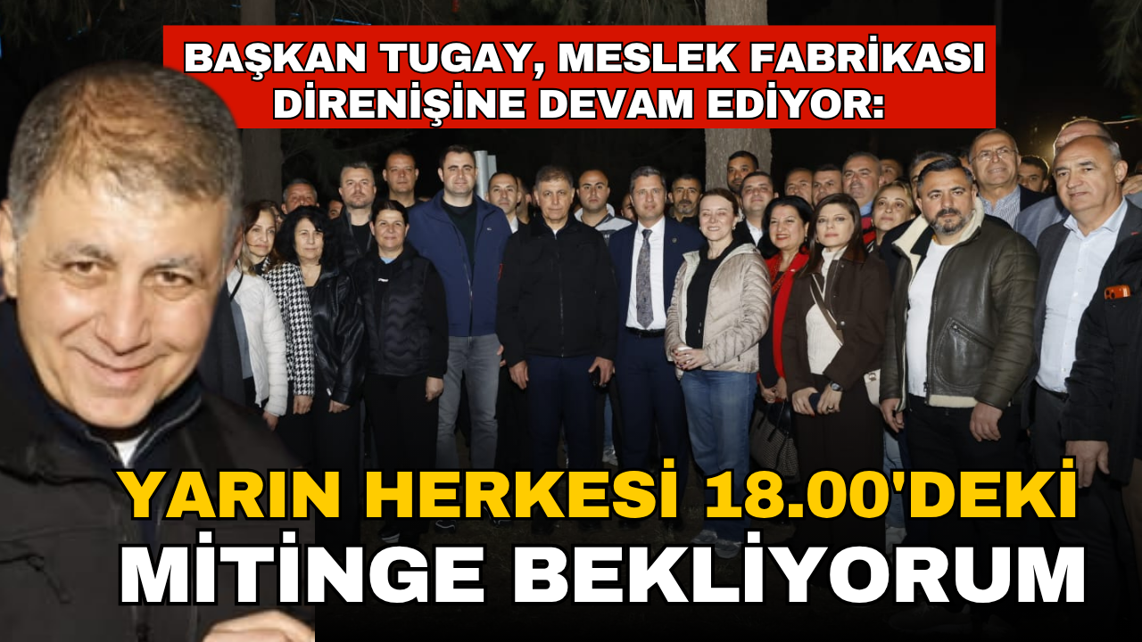 Nöbete gece boyu devam edeceklerini belirten Başkan Tugay, tüm İzmirlilere yarınki direnişe katılmaları için çağrıda bulundu. Tugay, "Şu an TOMA’ların arasında, barikatın önünde milletvekillerimiz ve belediye başkanlarımızla birlikte nöbet tutuyoruz. Kimsenin bireysel bir çıkarı yok ama İzmir halkına bu şekilde bir müdahalenin yapılmasını kabul edemiyoruz. Bu gece ben, belediye başkanlarımız, il başkanlarımız ve sivil toplum kuruluşlarımız buradayız. Dün gece boyunca sabaha kadar gözümüzü kırpmadan oturduk, paylaşımlar yaptık, insanlarla konuştuk. Yarın saat 18.00’de büyük bir miting yapacağız. İzmir’de herkesi bu direnişe sahip çıkmaya bekliyoruz" dedi.