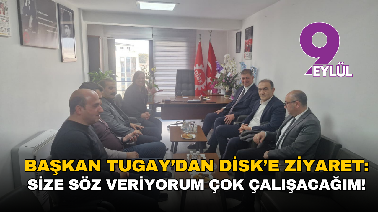 SEMİ TEKTAŞ/İzmir Büyükşehir Belediye Başkanı Cemil Tugay, DİSK Ege Bölge Temsilciliği görevine getirilen Deniz Şahin Gümüştekin’e tebrik ziyaretinde bulundu. DİSK Ege Bölge Temsilciliği binasında gerçekleştirilen ziyarete şube temsilcileri de katıldı. Burada açıklamalarda bulunan Tugay, sendika ile belediyenin birlik içinde olması gerektiğini belirtti. Tugay, “Ben her zaman çalışma arkadaşlarımıza sahip çıkıp haklarını almaları için elimden geleni yaptım. Yapabildiğimizi yapıyoruz, yapamadıklarımız için de anlayış bekliyoruz” ifadelerini kullandı.