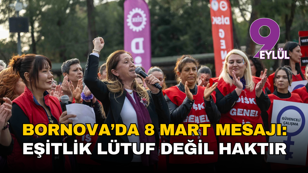 Bornova Belediye Başkanı Ömer Eşki adına konuşan Bornova Belediye Başkan Yardımcısı Duygu Bölük ise 8 Mart’ın yalnızca bir kutlama günü değil, emek ve hak mücadelesinin simgesi olduğunu söyledi.