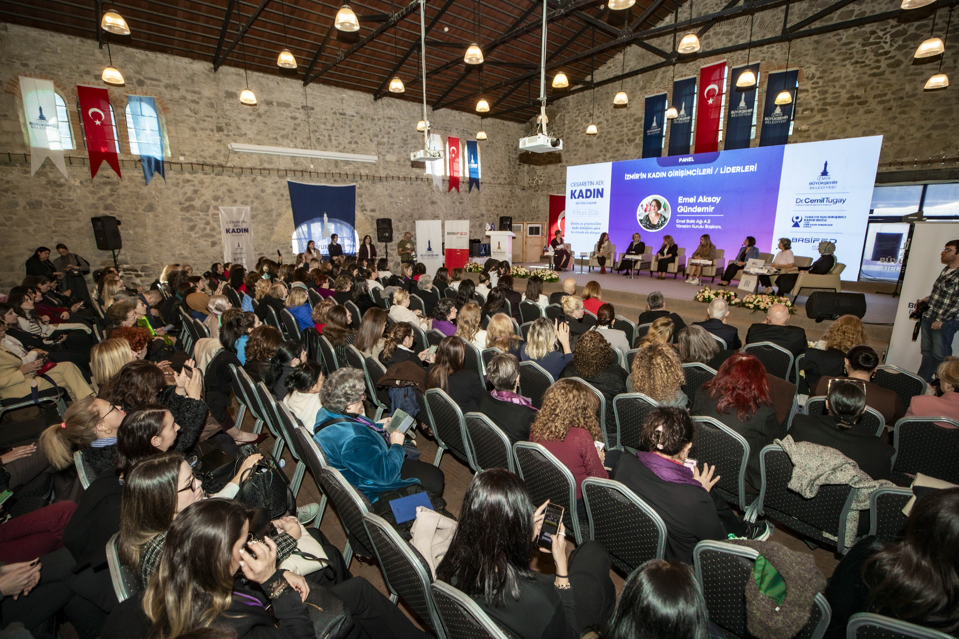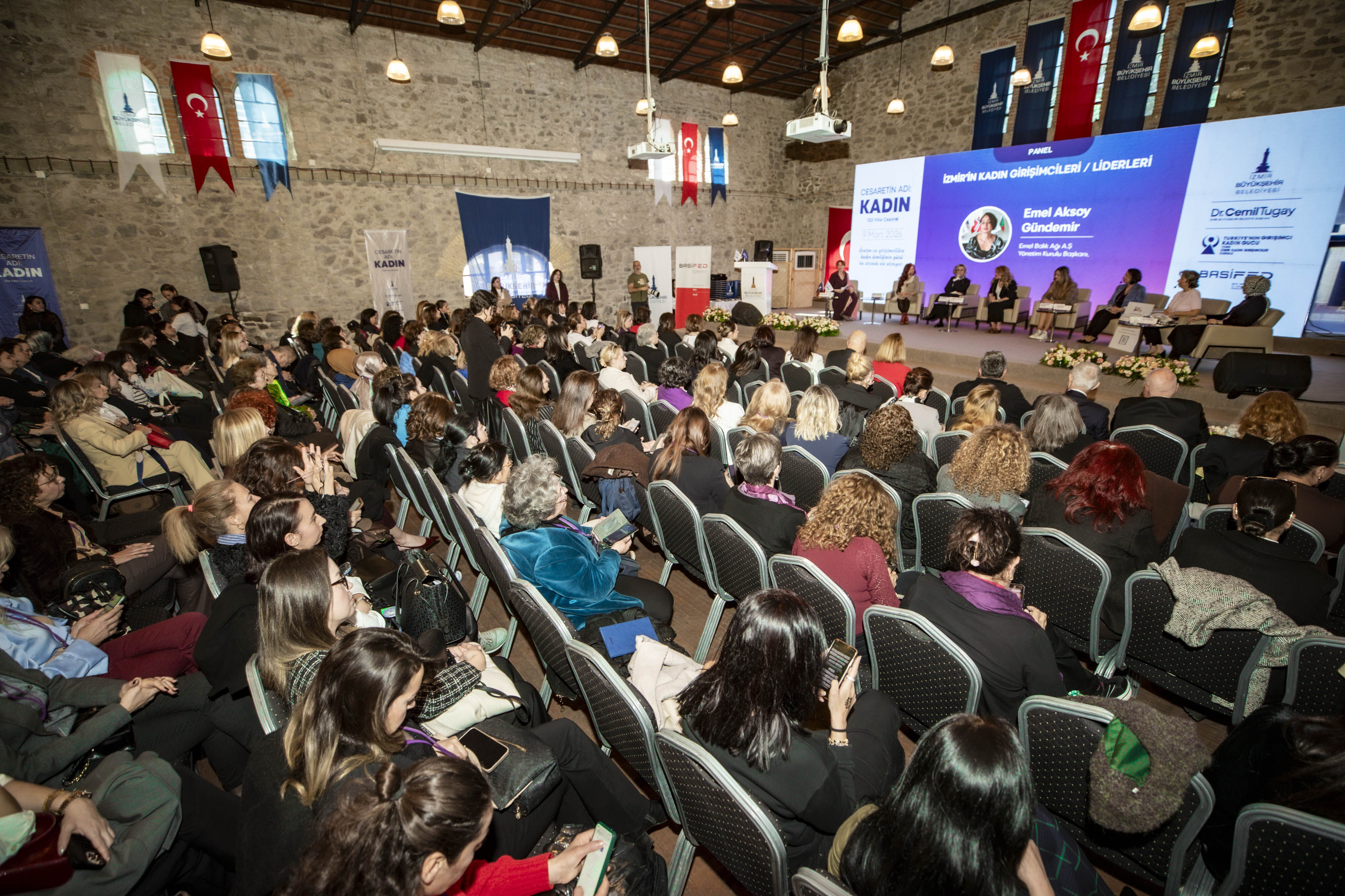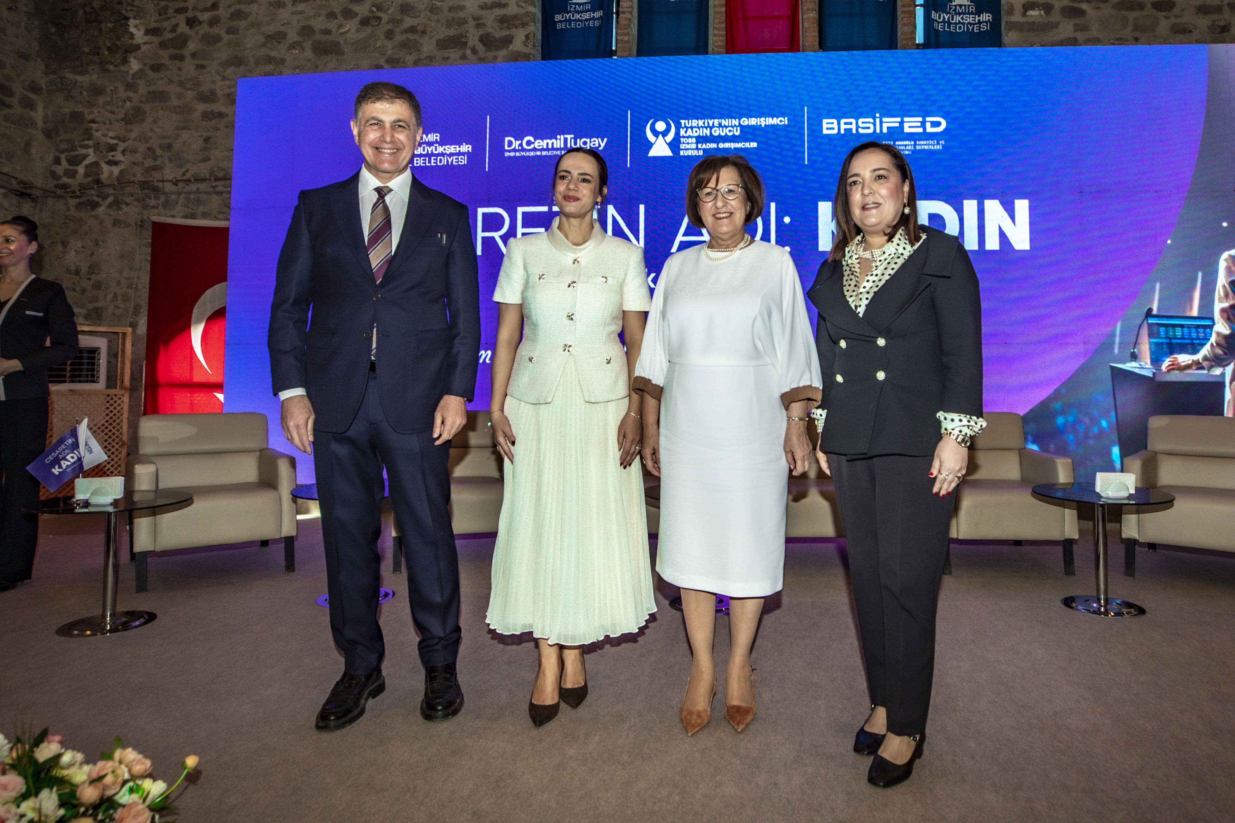 İZMİR Büyükşehir Belediyesi, BASİFED ve TOBB İzmir Kadın Girişimciler Kurulu iş birliğiyle düzenlenen “Cesaretin Adı: Kadın” zirvesi, Tarihi Havagazı Fabrikası’nda gerçekleştirildi. Zirveye İzmir Büyükşehir Belediye Başkanı Cemil Tugay, BASİFED Başkanı Semiha Güneş, projenin fikir lideri Öznur Tugay, TOBB İzmir Kadın Girişimciler Kurulu Başkanı Deniz Celep, belediye başkanları Saniye Bora Fıçı (Foça), İlkay Erdoğan (Karaburun), Ünal Işık (Gaziemir), İzmir Gazeteciler Cemiyeti (İGC) Başkanı Dilek Gappi katıldı. Panellerde girişimcilikten sağlığa, medyadan iş dünyasındaki engellere kadar pek çok konu masaya yatırıldı. Demet Cengiz moderatörlüğünde Müjde Tönbekici, Ece Sarıoğlu, Günce Kazazoğlu, Aleyna Yıldız Gültekin, Emel Aksoy Gündemir, Serap Çatalyürek ve Sümeyye Kınalı deneyimlerini aktardı. Hülya Maral yönetiminde Op. Dr. Hatice Aktan ve Prof. Dr. Emine Nur Tozan sağlık etkilerini; Bedia Ceylan Güzelce eşliğinde Yaprak Özer, Ayşe Kökçü ve Fügen Toksü medya temsilini; Ahu Tanrıkulu Orakçıoğlu moderatörlüğünde ise Füsun Kuran, Mutlu Erturan ve Yasemin Yaşa Erkut sistemsel engelleri tartıştı. Prof. Dr. Soner Yıldırım ve yazar Ahmet Şerif İzgören’in sunumlarıyla zenginleşen zirve, kadının toplumdaki gücüne vurgu yaparak sona erdi.