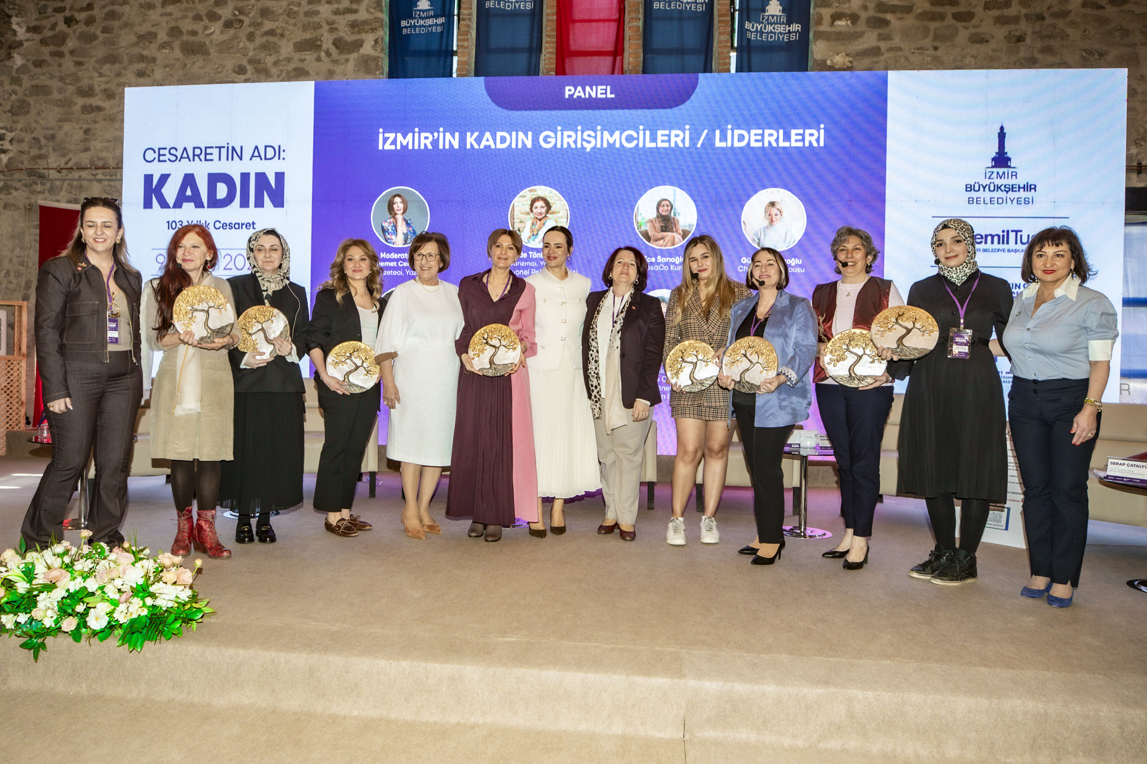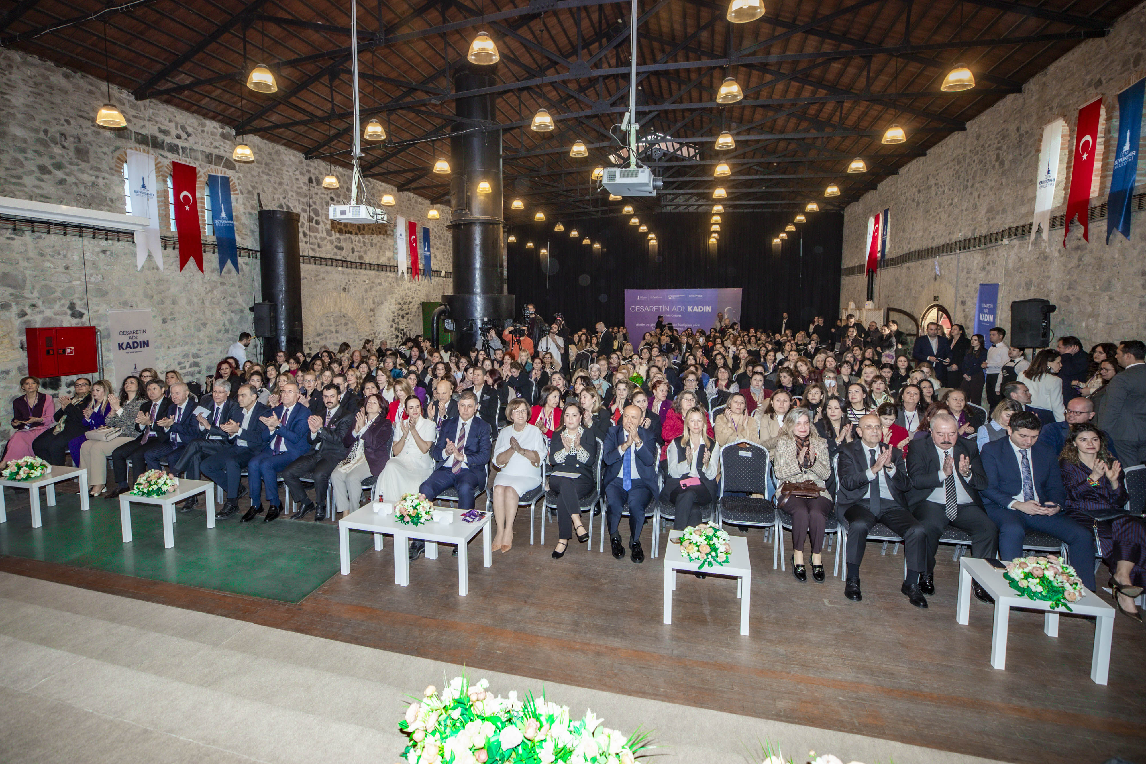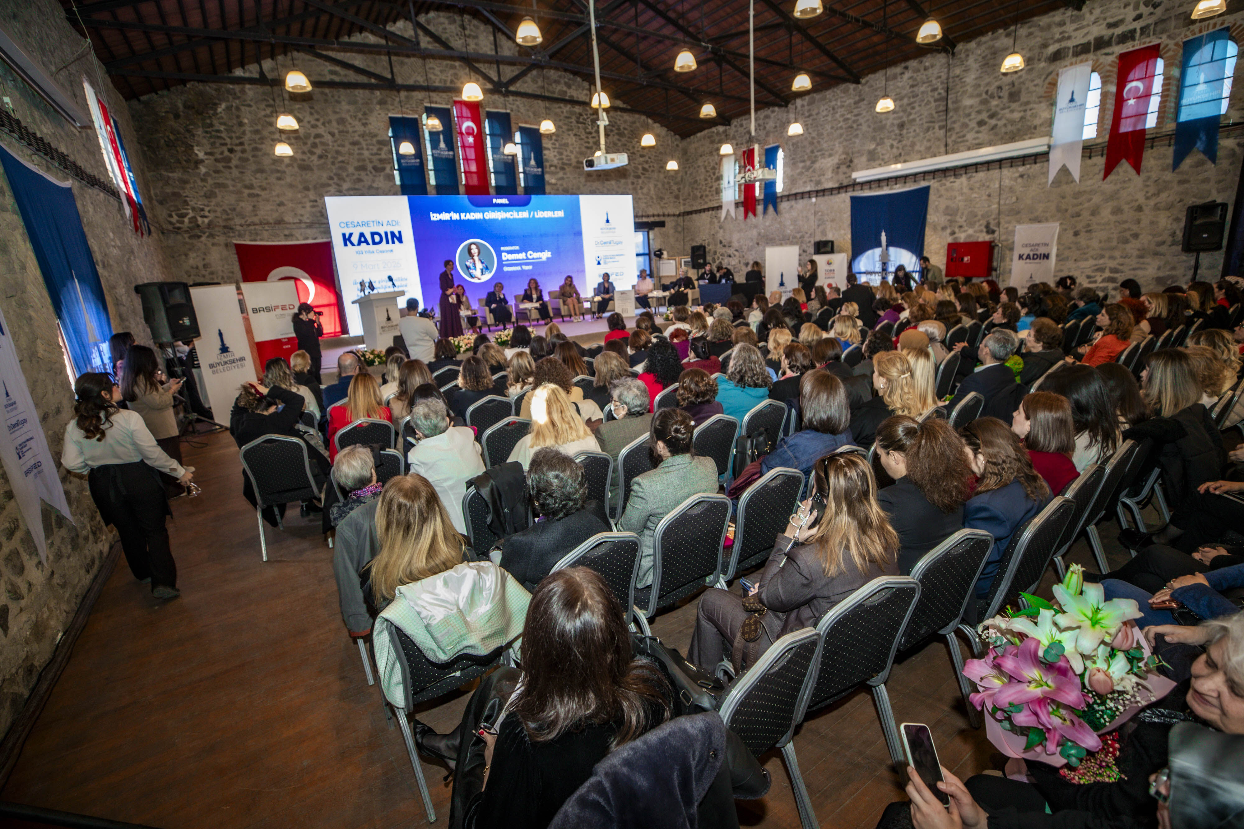 İZMİR Büyükşehir Belediyesi, BASİFED ve TOBB İzmir Kadın Girişimciler Kurulu iş birliğiyle düzenlenen “Cesaretin Adı: Kadın” zirvesi, Tarihi Havagazı Fabrikası’nda gerçekleştirildi. Zirveye İzmir Büyükşehir Belediye Başkanı Cemil Tugay, BASİFED Başkanı Semiha Güneş, projenin fikir lideri Öznur Tugay, TOBB İzmir Kadın Girişimciler Kurulu Başkanı Deniz Celep, belediye başkanları Saniye Bora Fıçı (Foça), İlkay Erdoğan (Karaburun), Ünal Işık (Gaziemir), İzmir Gazeteciler Cemiyeti (İGC) Başkanı Dilek Gappi katıldı. Panellerde girişimcilikten sağlığa, medyadan iş dünyasındaki engellere kadar pek çok konu masaya yatırıldı. Demet Cengiz moderatörlüğünde Müjde Tönbekici, Ece Sarıoğlu, Günce Kazazoğlu, Aleyna Yıldız Gültekin, Emel Aksoy Gündemir, Serap Çatalyürek ve Sümeyye Kınalı deneyimlerini aktardı. Hülya Maral yönetiminde Op. Dr. Hatice Aktan ve Prof. Dr. Emine Nur Tozan sağlık etkilerini; Bedia Ceylan Güzelce eşliğinde Yaprak Özer, Ayşe Kökçü ve Fügen Toksü medya temsilini; Ahu Tanrıkulu Orakçıoğlu moderatörlüğünde ise Füsun Kuran, Mutlu Erturan ve Yasemin Yaşa Erkut sistemsel engelleri tartıştı. Prof. Dr. Soner Yıldırım ve yazar Ahmet Şerif İzgören’in sunumlarıyla zenginleşen zirve, kadının toplumdaki gücüne vurgu yaparak sona erdi.