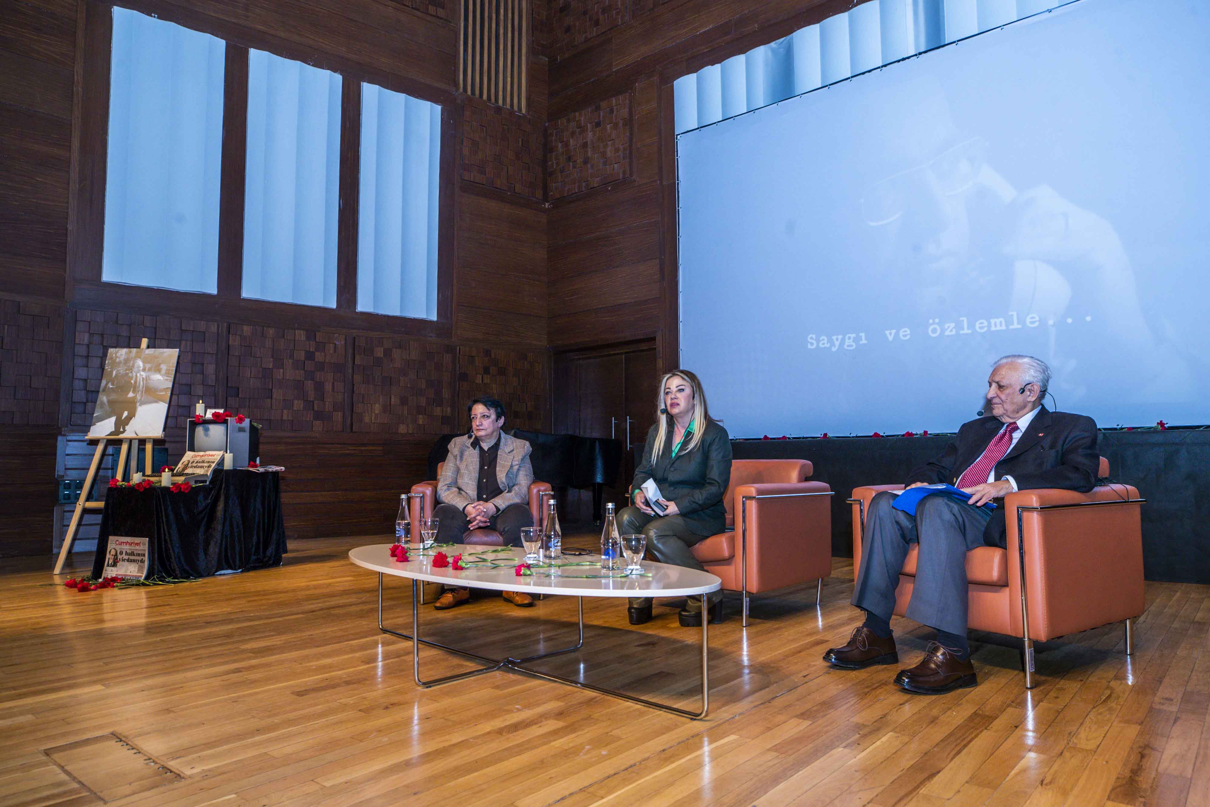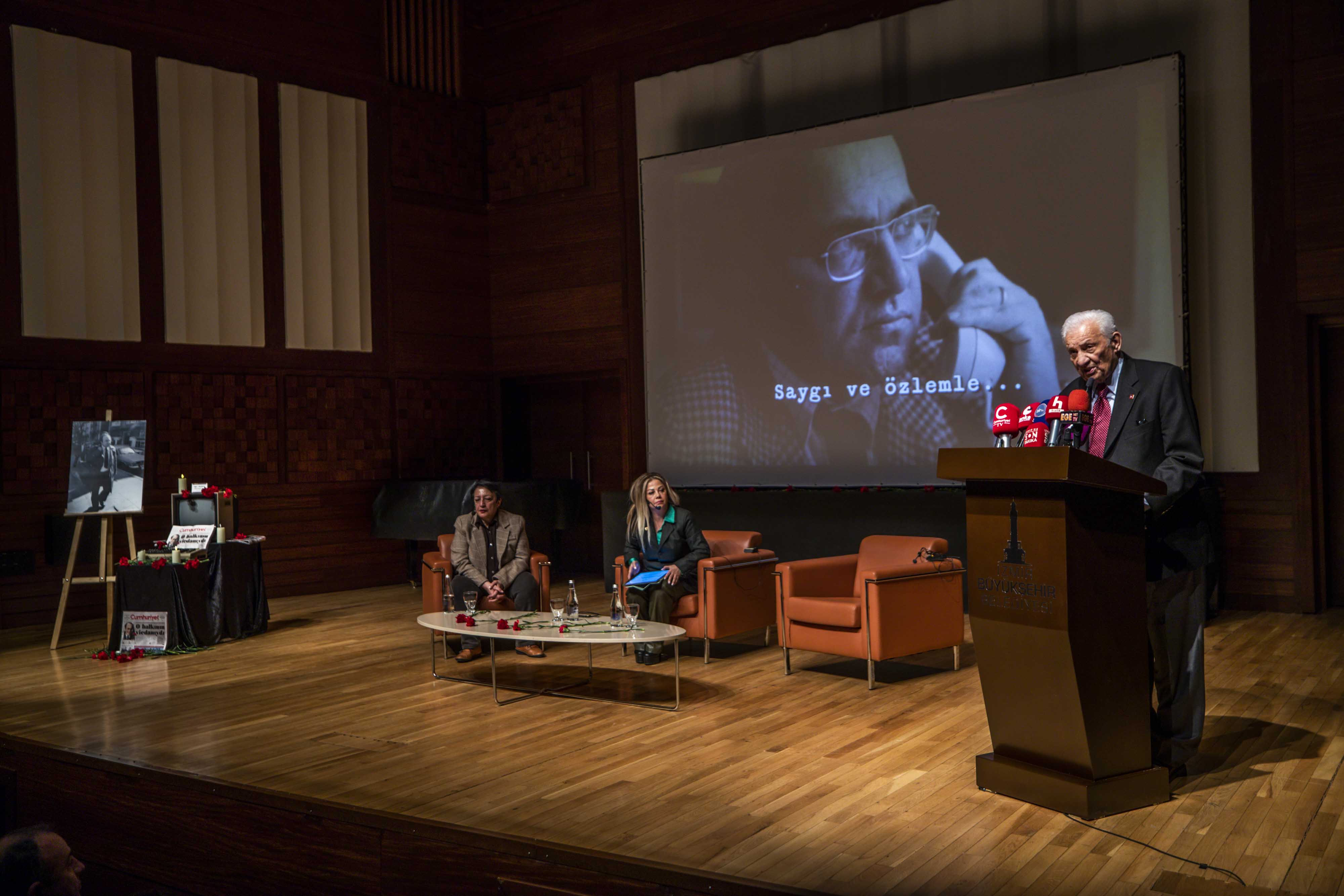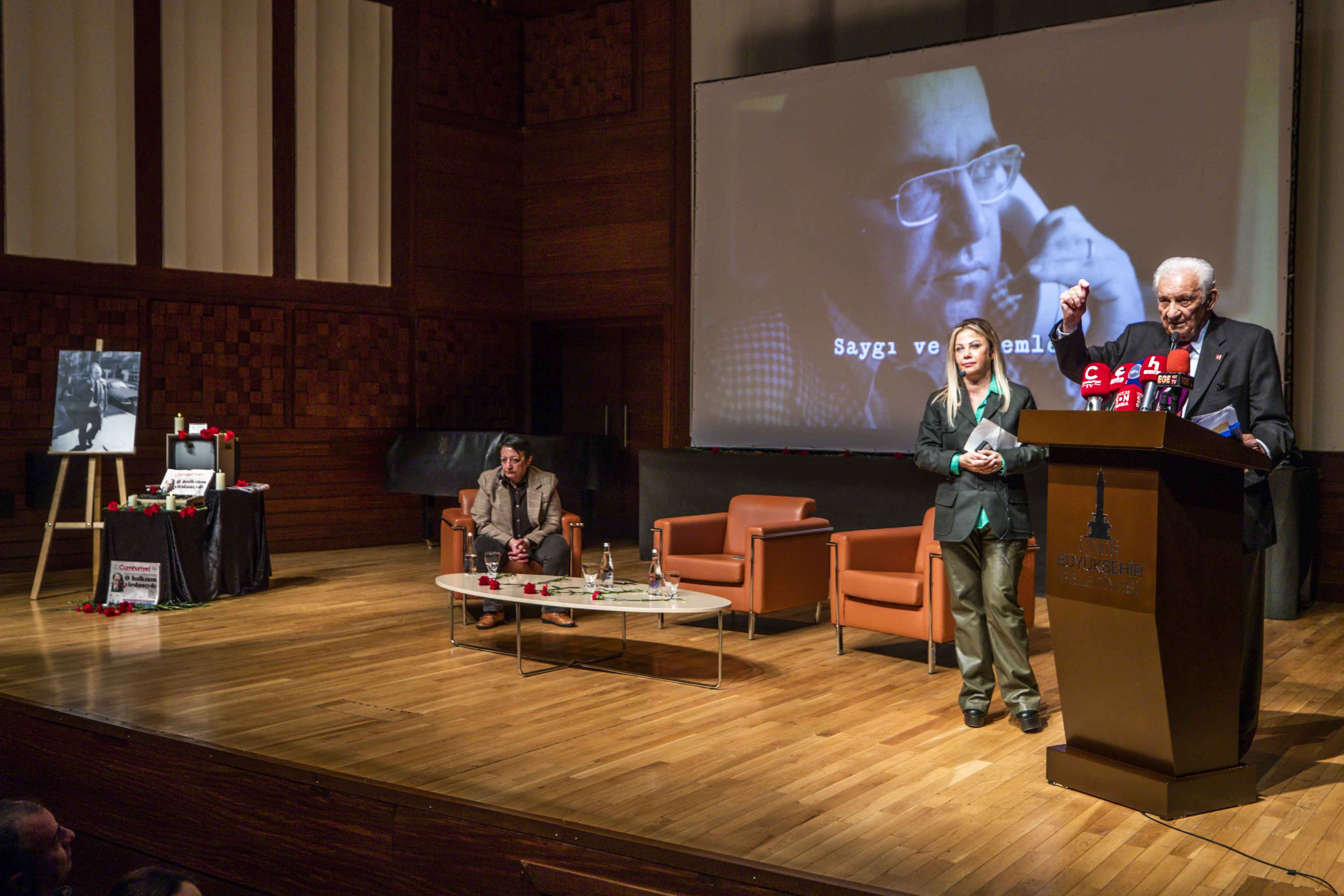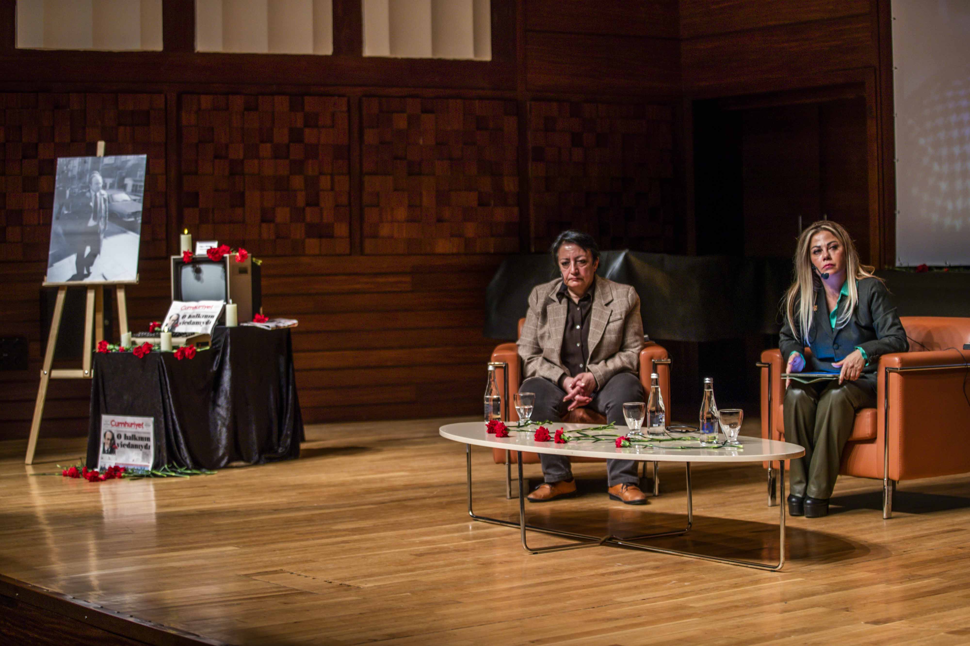 Anma programının söyleşi bölümünde gazetecilik, demokrasi ve aydınlanma mücadelesi Uğur Mumcu’nun mirası üzerinden ele alındı. Söyleşinin moderatörlüğünü İzmir Gazeteciler Cemiyeti Başkanı Dilek Gappi üstlenirken, Cumhuriyet Vakfı Başkanı Alev Coşkun ve Cumhuriyet Gazetesi Yazarı Miyase İlknur konuşmacı olarak yer aldı.