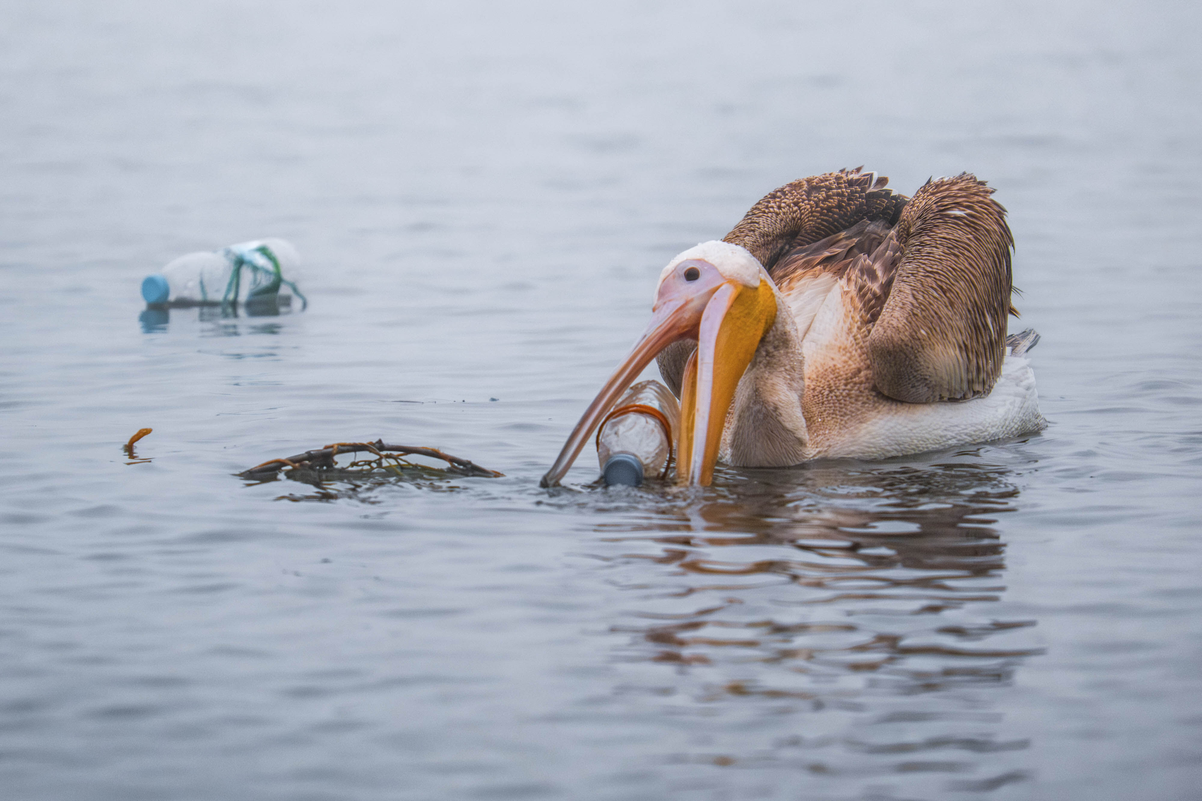 Sıfır Atık Özel Ödülü Adem ALBAYRAK Bursa’nın Gölyazı ilçesindeki gölde pelikanlar, çevre kirliliği arasında balık avlamaya çalışıyor.
