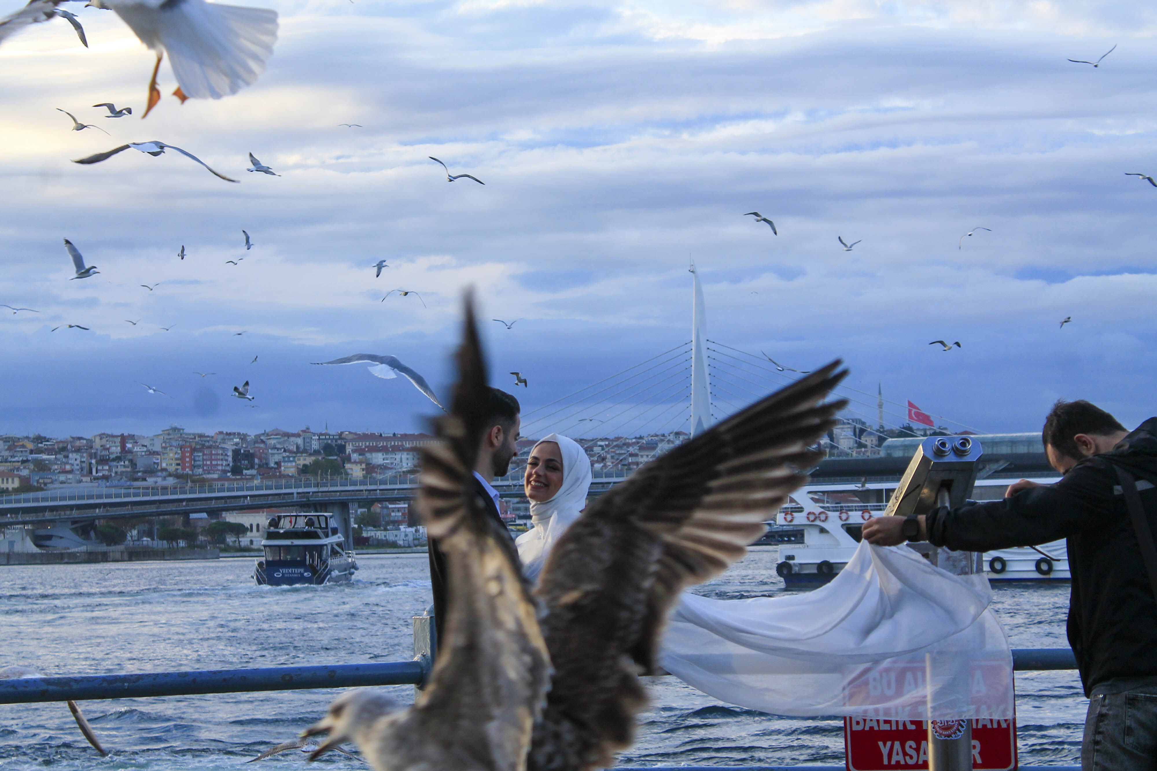 Ara Güler Özendirme Ödülü Elif ÇİMİÇ / Kırşehir Ahi Evran Üniversitesi İstanbul Galata Köprüsü’ndeki seyir yerinde çiftlerin fotoğraf çektirirken yaşadıkları mutluluğa martılar da eşlik etti.
