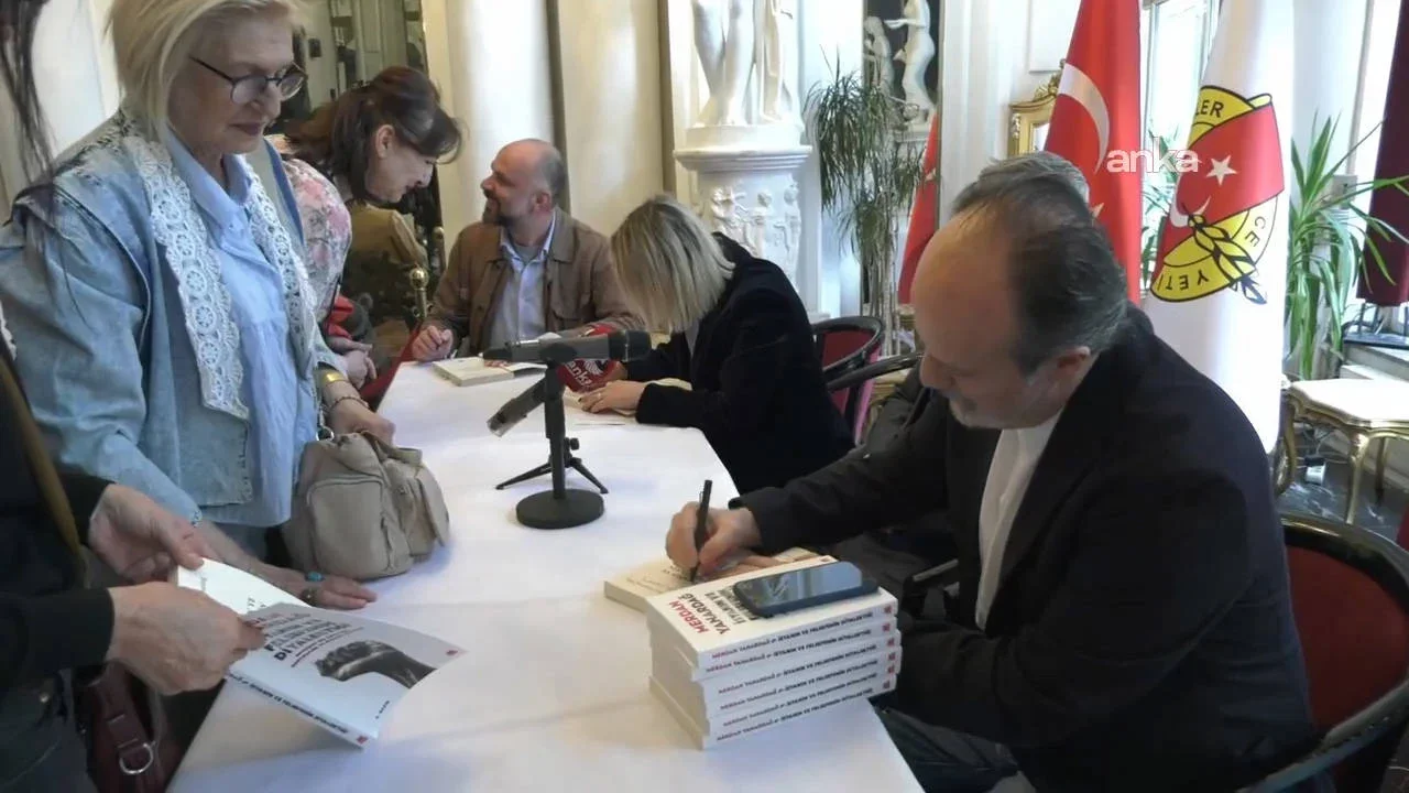 Daha sonra Merdan Yanardağ'ın son kitabı "İsyanın ve Felsefenin Diyalektiği: Devrimci Bir Çıkış İçin Sosyolojik ve Siyasal Etütler" kitabını etkinliğe katılan temsilci ve gazeteciler Yanardağ adına imzaladı.