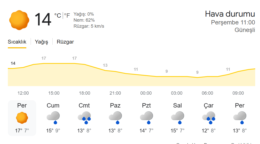 | Perşembe | Güneşli | 7°C | 17°C |