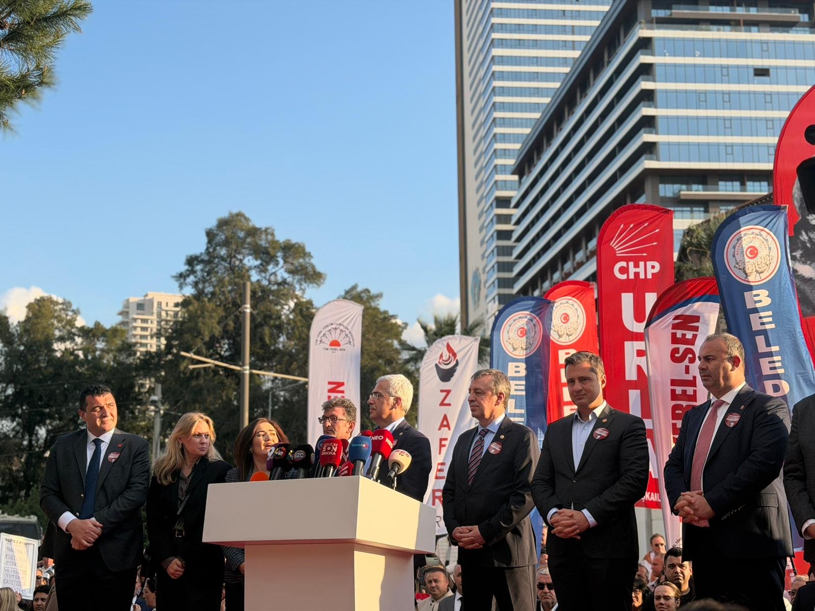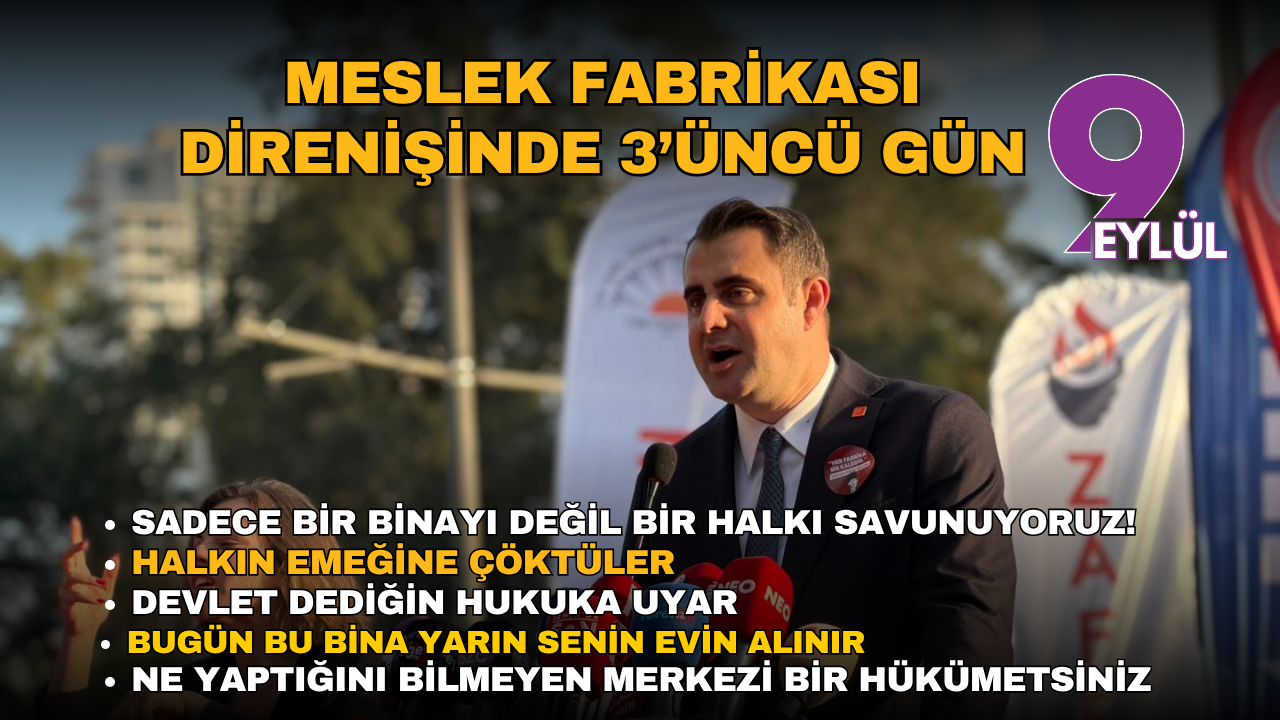 SEMİ TEKTAŞ/Meslek Fabrikası direnişinde 3’üncü gün geride kalmak üzere. Meslek Fabrikasının mülkiyetinin Vakıflar Genel Müdürlüğüne devredilmesinden sonra tahliye edilmeye başlanılmıştı. Tahliye sonrasında kente yoğun bir tepki furyası başlamıştı. Cumhuriyet Halk Partisi, STK, dernek ve işçilerin çağrısıyla binlerce vatandaş Meslek Fabrikası karşısında bir araya geldi. Mitinge İzmir Büyükşehir Belediye Başkanı Cemil Tugay, Cumhuriyet Halk Partisi İl Başkanı Çağatay Güç, CHP Genel Başkan Yardımcısı Ulaş Karasu, CHP İzmir Milletvekilleri Deniz Yücel, Seda Kaya Ösen, Sevda Erdan Kılıç, Rahmi Aşkın Türeli, Yüksel Taşkın, Ednan Arslan, Ümit Özlale, Salih Uzun, CHP’li ilçe belediye başkanları, CHP ilçe başkanları, DİSK, KESK, TÜRK-İş, İzmir Barosu, İzmir Tabip Odası, İzmir Gazeteciler Cemiyeti, TMMOB, İzmir Kent Konseyi, siyasi parti temsilcileri ve binler vatandaş katıldı.