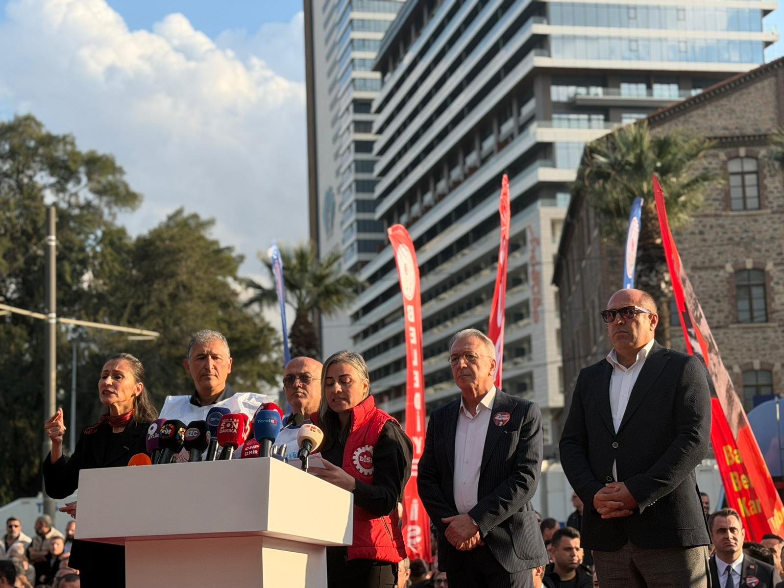 İzmir Emek ve Demokrasi Güçleri adına konuşan DİSK Ege Bölge Temsilcisi Deniz Şahin Gümüştekin, Meslek Fabrikası’nın yalnızca bir bina olmadığını, kentin toplumsal hafızasında önemli bir yere sahip bulunduğunu söyledi.