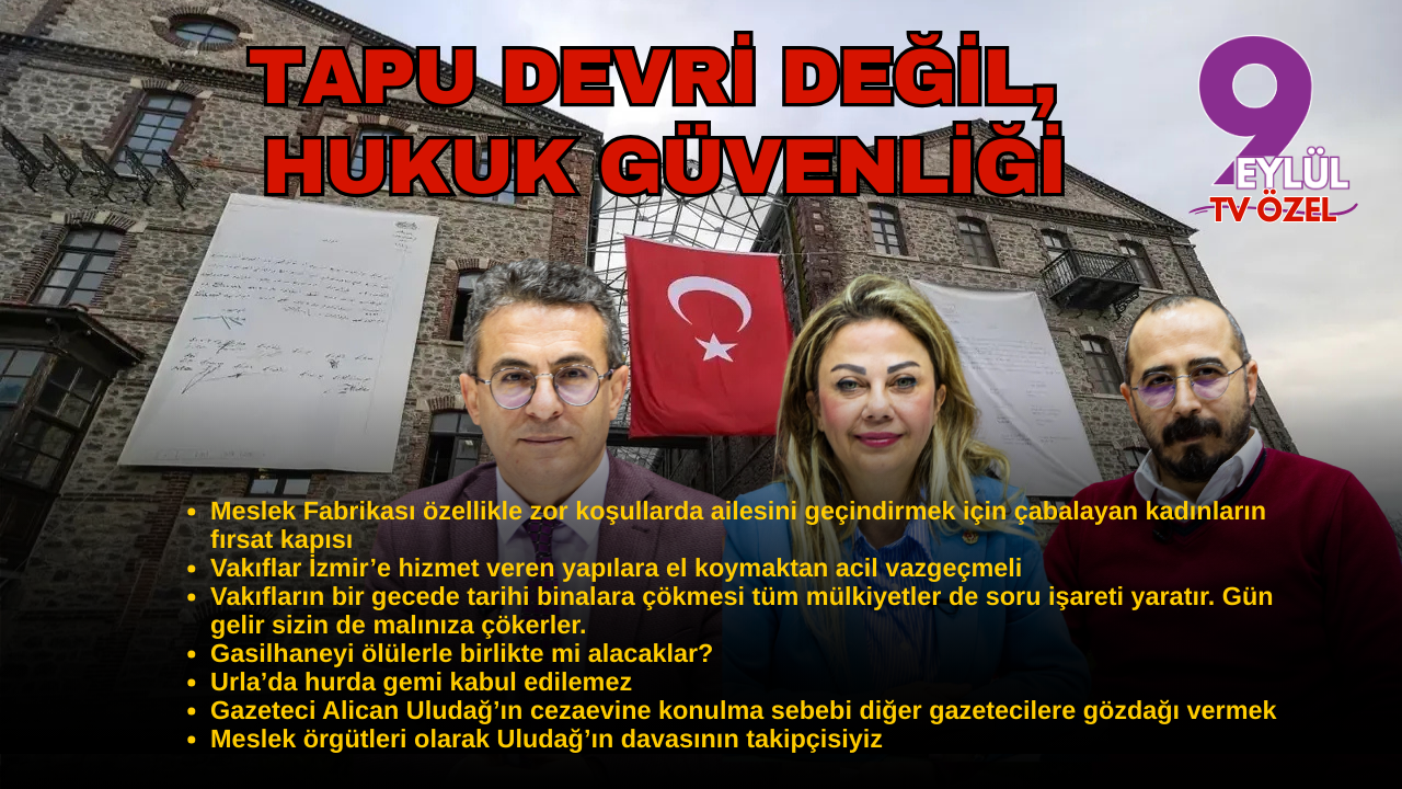 Programda, Vakıflar Bölge Müdürlüğü tarafından İzmir Büyükşehir Belediyesi’ne ait üç binaya el konulmak istenmesi yönelik hukuki süreç ve AK Parti İzmir Milletvekili Mahmut Atilla Kaya’nın “Meslek Fabrikası, Bakırçay Üniversitesi'nin Hukuk Fakültesi olacak” açıklaması değerlendirildi.