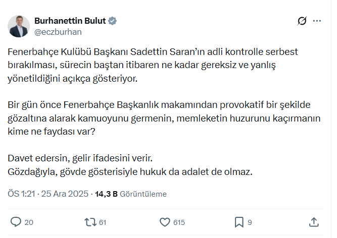 Uyuşturucu soruşturması kapsamında gözaltına alınan ve daha sonra “imza atma” şeklindeki adli kontrol şartıyla serbest bırakılan Fenerbahçe Spor Kulübü Başkanı Sadettin Saran hakkında konuşan Burhanettin Bulut, sürecin başından itibaren yanlış yönetildiğini ifade etti.
