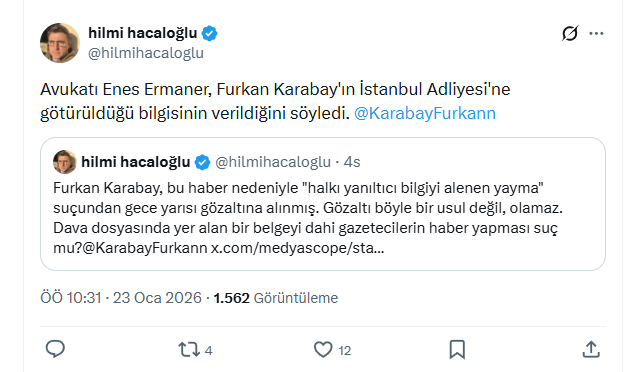 Karabay’ın gözaltına alındığını ilk duyuran isim avukatı Enes Ermaner oldu. Ermaner, sosyal medya hesabından yaptığı paylaşımda müvekkilinin İBB soruşturması kapsamında gözaltına alındığını açıklamış, suçlamanın TCK 217/A maddesine dayandırıldığını belirtmişti.