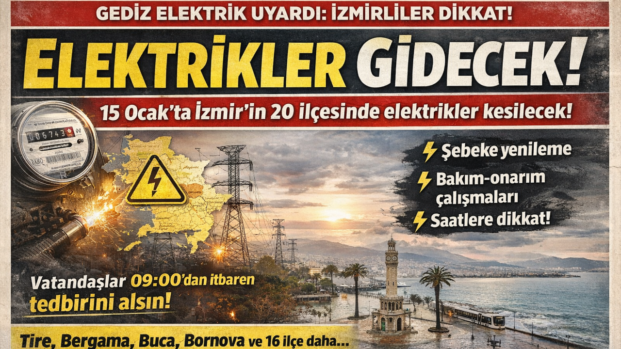 Gediz Elektrik, İzmir’de 15 Ocak Perşembe günü yapılacak planlı çalışmalar nedeniyle çok sayıda noktada elektrik kesintisi uygulanacağını duyurdu. Şirketin açıklamasına göre kesintiler; şebeke yenileme, bakım-onarım ve hat iyileştirme çalışmaları kapsamında gerçekleştirilecek. Vatandaşların özellikle cihaz güvenliği ve günlük planlamalar için kesinti saatlerine dikkat etmesi istendi.