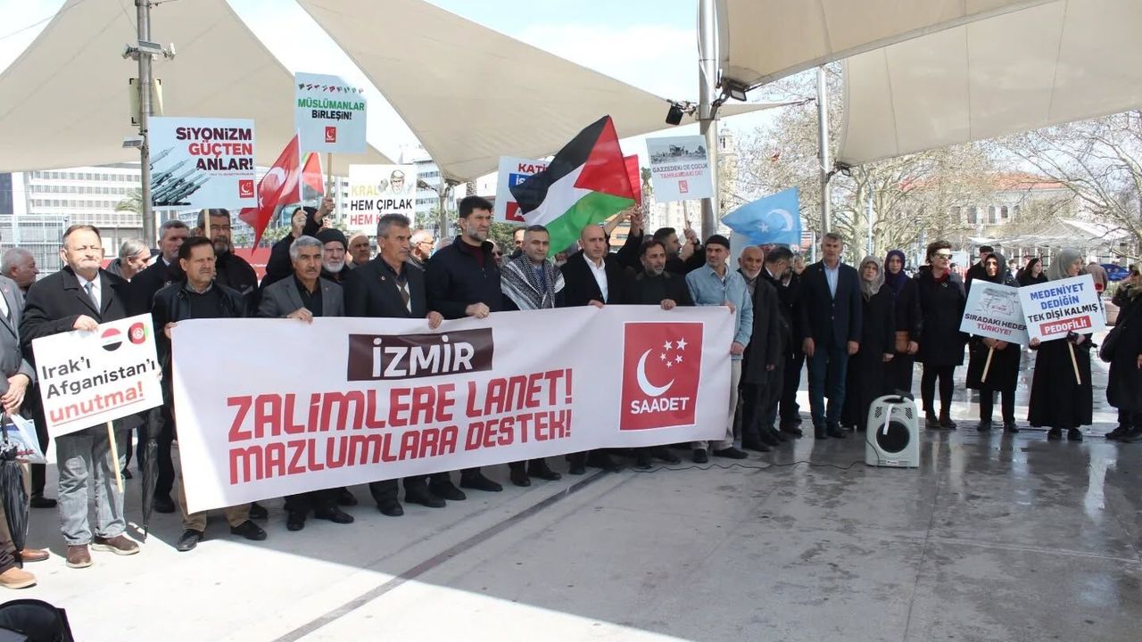 Saadet Partisi İzmir İl Teşkilatı, ABD ve İsrail'in İran, Lübnan ve Gazze'ye yönelik saldırılarını ve Mescid-i Aksa'nın Ramazan Bayramı da dahil olmak üzere yaklaşık bir aydır ibadete kapatılmasını protesto etmek ve amacıyla "Zalimlere lanet mazlumlara destek" sloganıyla basın açıklaması gerçekleştirdi. Konak tramvay durağı önünde düzenlenen açıklamada partililer, "Siyonizm güçten anlar", "Kral hem çıplak hem katil", "Medeniyet dediğin tek dişi kalmış pedofili" yazılı dövizlerle yaşananlara tepki gösterdiler.