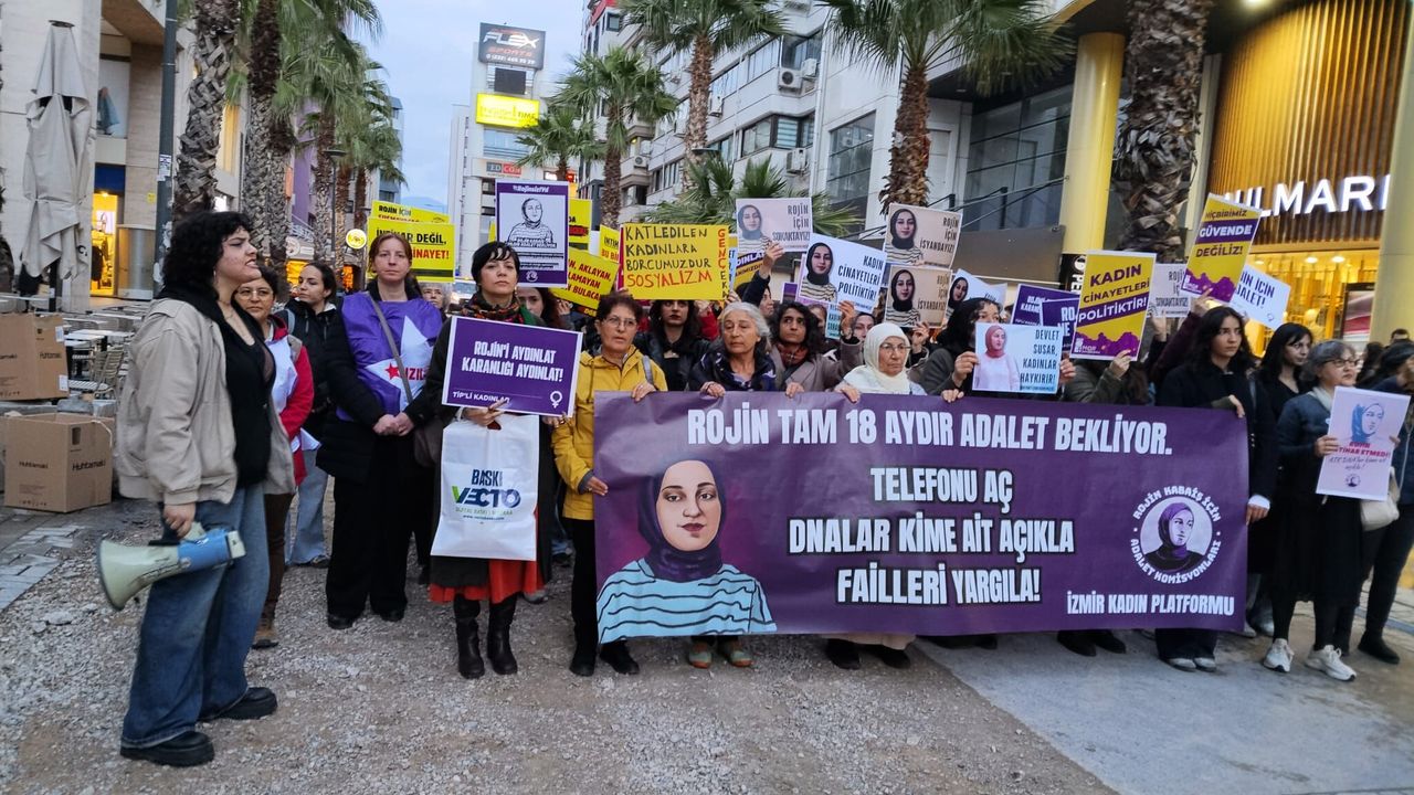 İzmir Kadın Platformu, Rojin Kabaiş’in katledilişinin 18. ayında yürüyüş ve basın açıklaması düzenledi. Alsancak Penguen Kitap Evi önünde toplanan kitle Türkan Saylan Kültür Merkezi önüne yürüdü. Sık sık “Rojin için adalet herkes için adalet”, “Koruma aklama failleri yargıla”, “Rojin Kabaiş isyanımızdır” sloganlarının atıldığı eylemde basın metnini Hayal Taşdan okudu. Rojin Kabaiş’in kaybedilip katledilmesinin üzerinden 18 ay geçtiğini hatırlatan Taşdan, “18 aydır Rojin Kabaiş’in şüpheli ölümü aydınlatılmıyor, etkin bir soruşturma yürütülmüyor. 18 aydır kadınların ve Rojin’in ailesinin adalet talebine adeta kulak tıkanıyor” dedi. Delillerin gizlendiğini, sürecin uzatıldığını vurgulayan Taşdan, “Rojin’in ailesi sistematik bir biçimde tehdit ediliyor, mücadele eden kadınlar ise dezenformasyon yapmakla suçlanıyor. Biliyoruz ki; Rojin’in bedeninde tespit edilen 2 erkek DNA’sının nerelerde bulunduğu da dahil olmak üzere Rojin Kabaiş dosyasında açığa çıkan her gerçek, dönemin Adalet Bakanı’nın dezenformasyon yapmakla suçladığı kadınların mücadelesiyle açığa çıkmıştır” ifadelerini kullandı.