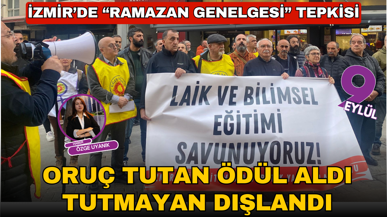 ÖZGE UYANIK/ İzmir’de Milli Eğitim Bakanlığı’nın okullarda Ramazan ayına yönelik etkinlikler düzenlenmesini öngören genelgesi tartışma yarattı. İzmir Laik Bilimsel Demokratik Yaşam Platformu, Alsancak Türkan Saylan Kültür Merkezi önünde bir araya gelerek söz konusu genelgenin öğrenciler arasında ayrımcılığa yol açtığını savundu. Basın açıklamasını Eğitim-Sen 1 No’lu Şube Başkanı Hamdi Çalık okudu.