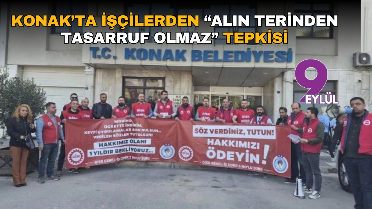 İzmir’de belediyelerde yaşanan toplu sözleşme krizlerine bir yenisi daha eklendi. Konak Belediyesi’nde çalışan işçiler, uzun süredir ödenmeyen alacakları nedeniyle belediye binası önünde eylem gerçekleştirdi. Genel-İş Sendikası öncülüğünde yapılan açıklamada, işçilerin haklarının geciktirilmesine tepki gösterildi.