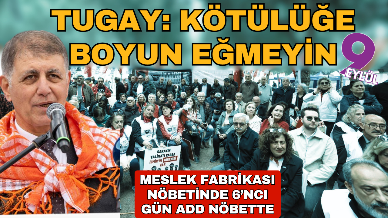 Toplantıda konuşan Başkan Dr. Cemil Tugay, sokakta karşılaştığı iki kişiden birinin destek mesajı ilettiğini söyleyerek, “Buraya gelemeyenlere söylüyorum, bulunduğunuz her yerden, her şekilde hem bu hukuksuzluğa, bu yalana dolana hem de maruz kaldığınız her türlü haksızlığa karşı sesinizi çıkarın, itiraz edin. Kötülüğü kimse kabullenmesin” dedi. Vakıflar Genel Müdürlüğü tarafından el konulan Meslek Fabrikası binası önünde İzmir Büyükşehir Belediye Başkanı Dr. Cemil Tugay’ın öncülüğünde başlatılan nöbet 6’ncı gününe ulaştı. Atatürkçü Düşünce Derneği (ADD) İzmir Eşgüdüm Toplantısını polis ablukasındaki Meslek Fabrikası alanında yapma kararı aldı. Toplantıya İzmir Büyükşehir Belediye Başkanı Dr. Cemil Tugay, ADD Genel Başkanı Dr. Mustafa Hüsnü Bozkurt, Cumhuriyet Halk Partisi (CHP) İzmir İl Başkanı Çağatay Güç, Bayraklı Belediye Başkanı İrfan Önal, geçmiş dönem İzmir Büyükşehir Belediye Başkanı Aziz Kocaoğlu, geçmiş dönem Çiğli Belediye Başkanı Utku Gümrükçü, ADD’nin İzmir’deki şube başkanları ve çok sayıda İzmirli katıldı.