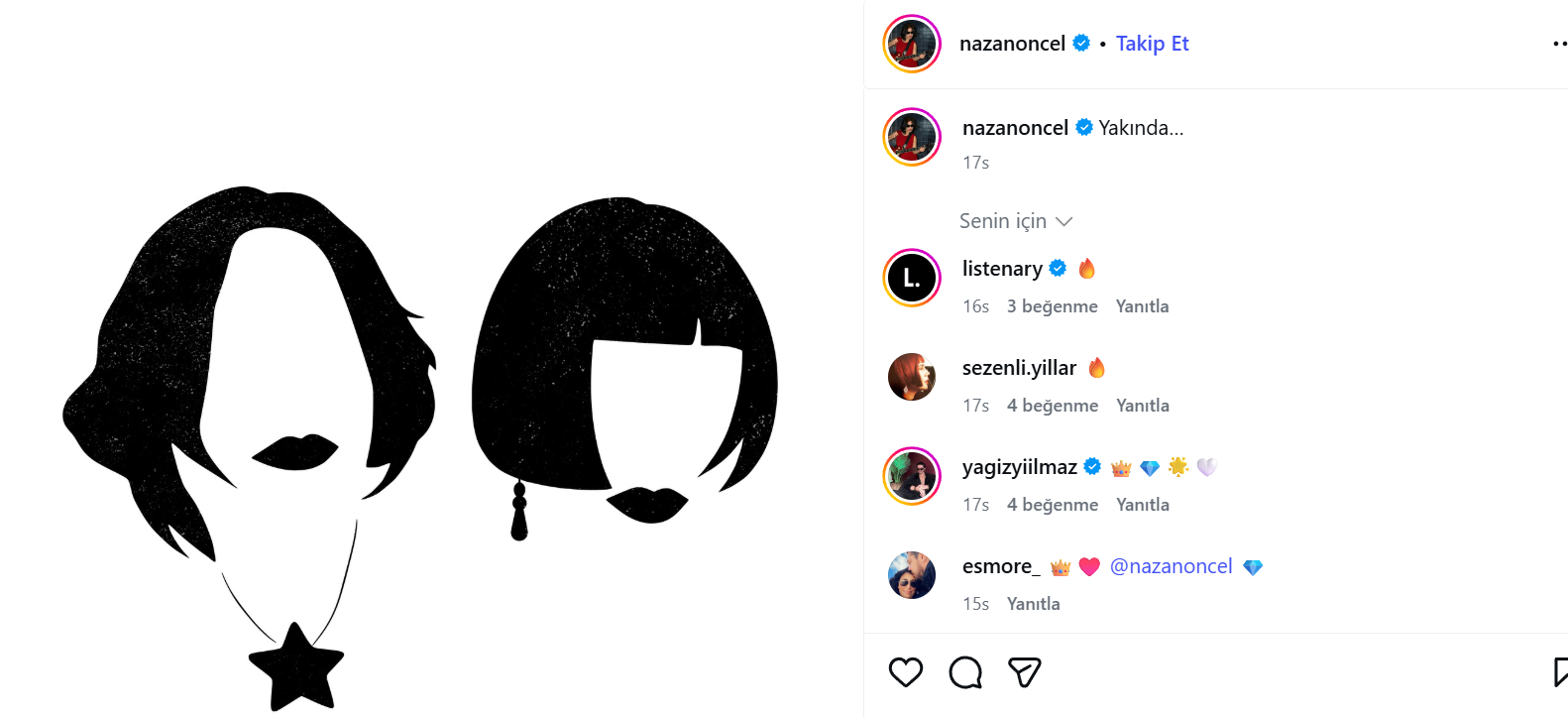 Minimalist bir tasarımla hazırlanan görseldeki karakteristik saç kesimleri ve yüz hatları, takipçilerin dikkatinden kaçmadı. Özellikle kısa saçlı silüetin Sezen Aksu’ya, diğer figürün ise Nazan Öncel’e ait olduğu yönündeki yorumlar sosyal medyada hızla öne çıktı.