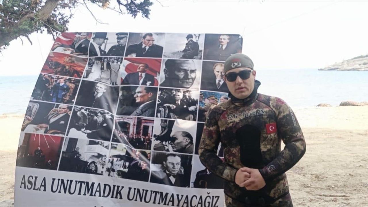 İzmirli dalgıç Yağız Göçmen (26), Ulu Önder Gazi Mustafa Kemal Atatürk’ü anmak için 10 Kasım öncesinde Karaburun’un Mordoğan açıklarında dalış yaptı.